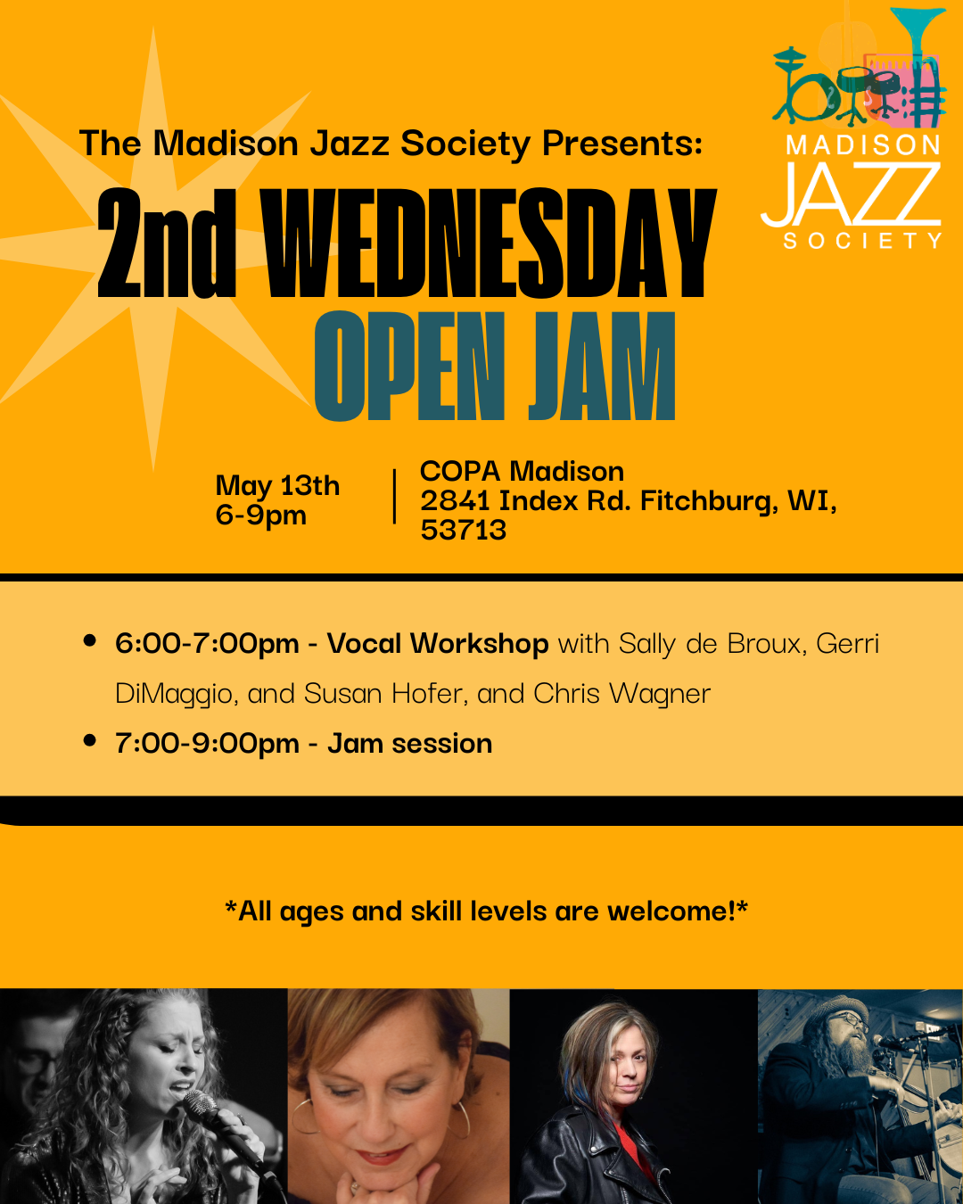 COPA 2841 Index Rd, Madison6-7pm - Vocal workshop with Sally de Broux, Gerri DiMaggio, Susan Hofer, and Chris Wagner 7-9pm - Jam session